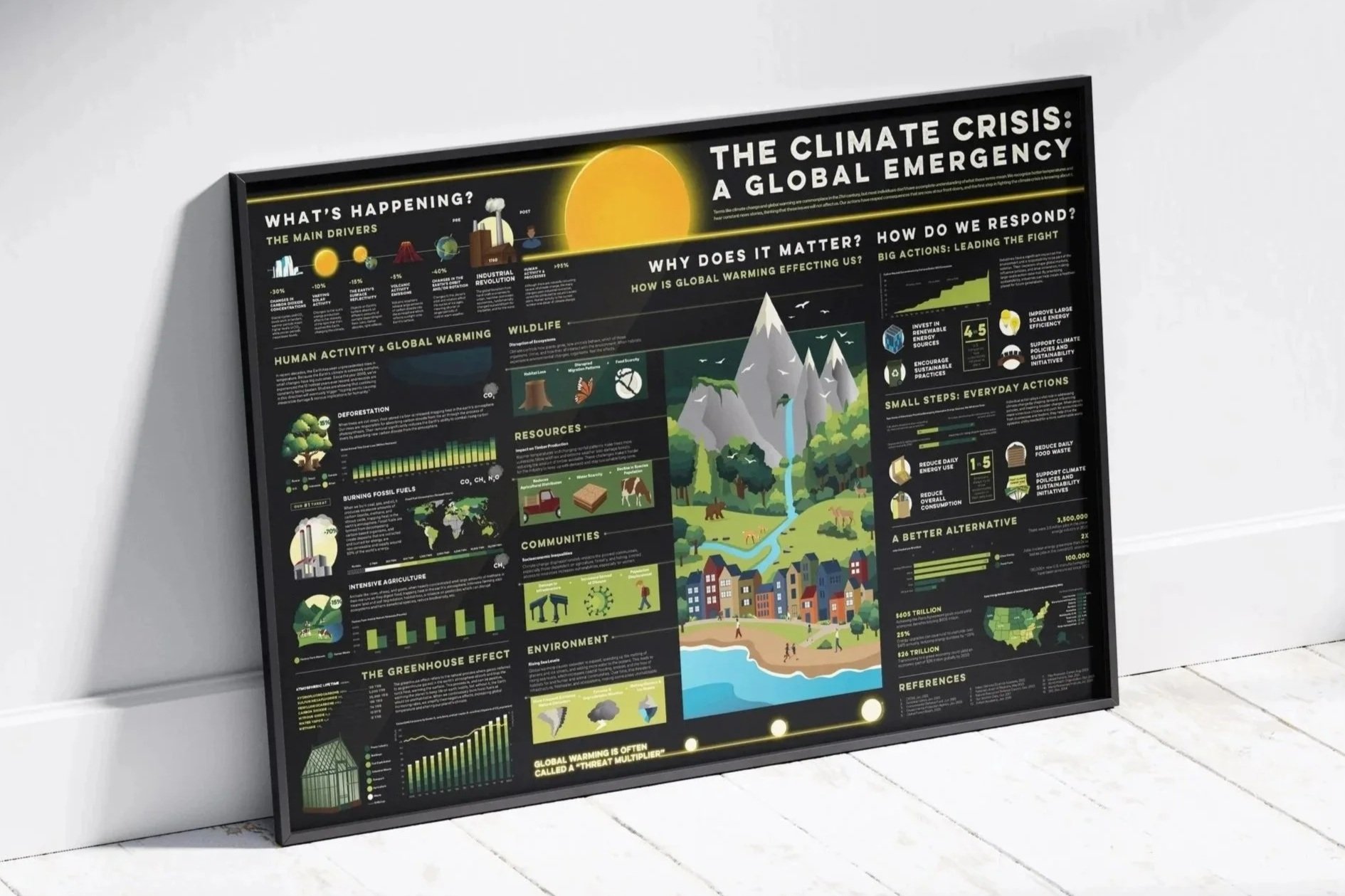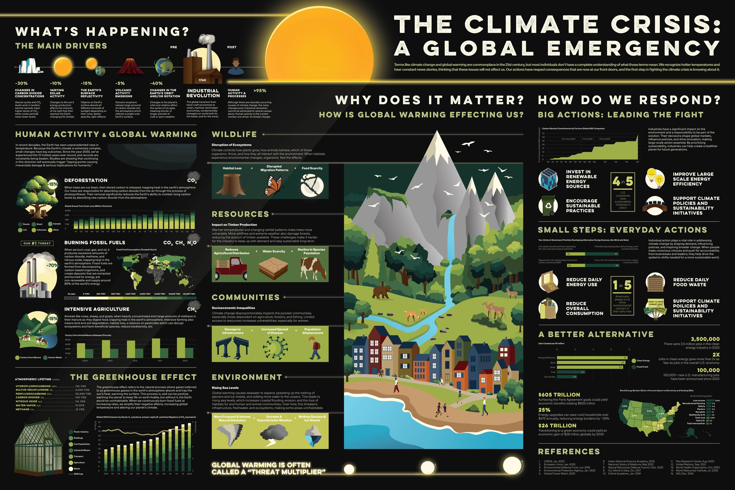 Large- scale infographic focusing on the ongoing climate crisis, focusing on three leading questions: What is happening? Why does it matter? And how do we respond? “Climate change” and “global warming” are all terms we hear frequently, but few people actually understand the complex issues plaguing our environment.